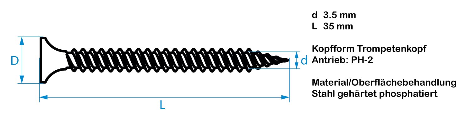 - Maße: Schnellbauschrauben 3.5 x 35 mm mit Feingewinde – ideal für Gipskarton auf Metallunterkonstruktionen.