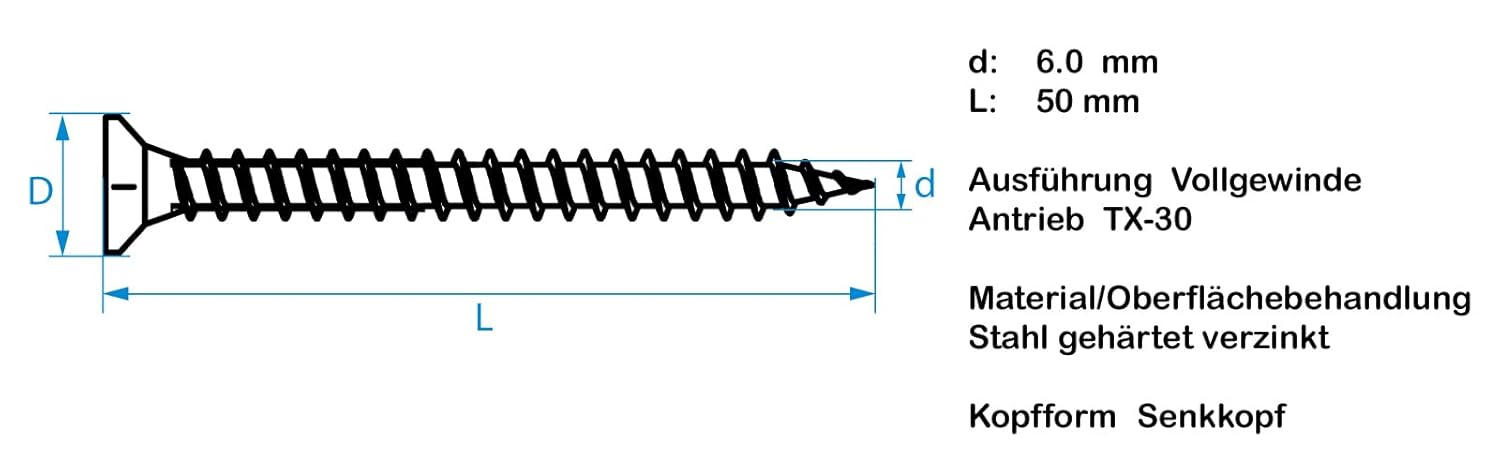 - D= 6 mm, L= 50 mm / Ausführung Vollgewinde / Antrieb: TX-30 / Material/Oberflächenbehandlung: gehärteter verzinkter Stahl