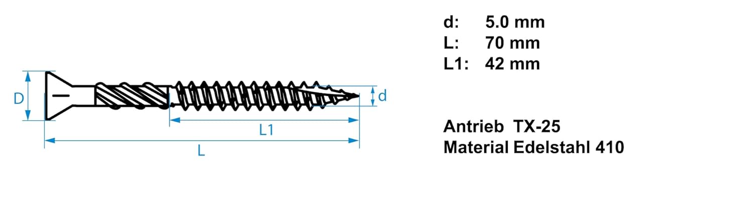- Optimale Maße für Terrassenbau: Terrassenschrauben 5.0 x 70/42 mm – perfekt geeignet für die Befestigung von Terrassendielen, Unterkonstruktionen und anderen Holzelementen im Außenbereich.