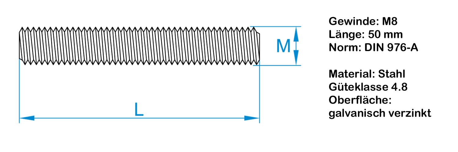 - Gewinde: M8 / Länge: 50 mm / Norm: DIN 976-A / Material: Stahl, Güteklasse 4.8 / Oberfläche: galvanisch verzinkt